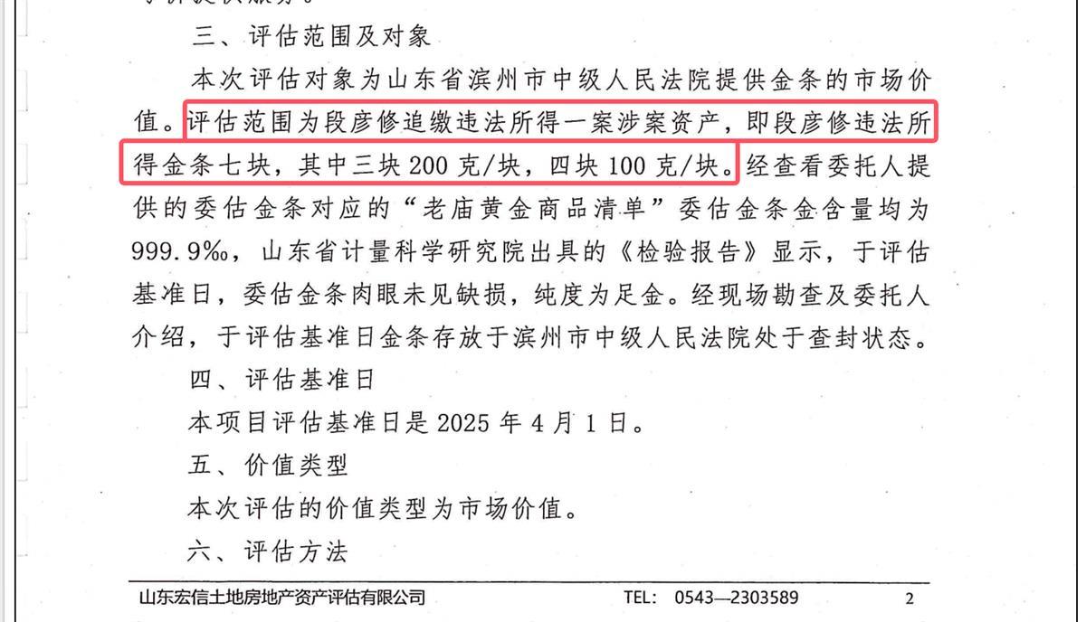 极目新闻查询法院公布的《评估报告》了解到,本次评估对象为山东省滨州市中级人民法院提供金条的市场价值。评估范围为段彦修追缴违法所得一案涉案资产,即段彦修违法所得金条七块。