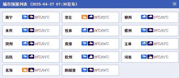 未来三天(4月27日至29日),广西强降雨和强对流天气频繁登场。其中今天,南宁、桂林、柳州等地部分地区将出现中到大雨,局地暴雨,公众需注意防范。