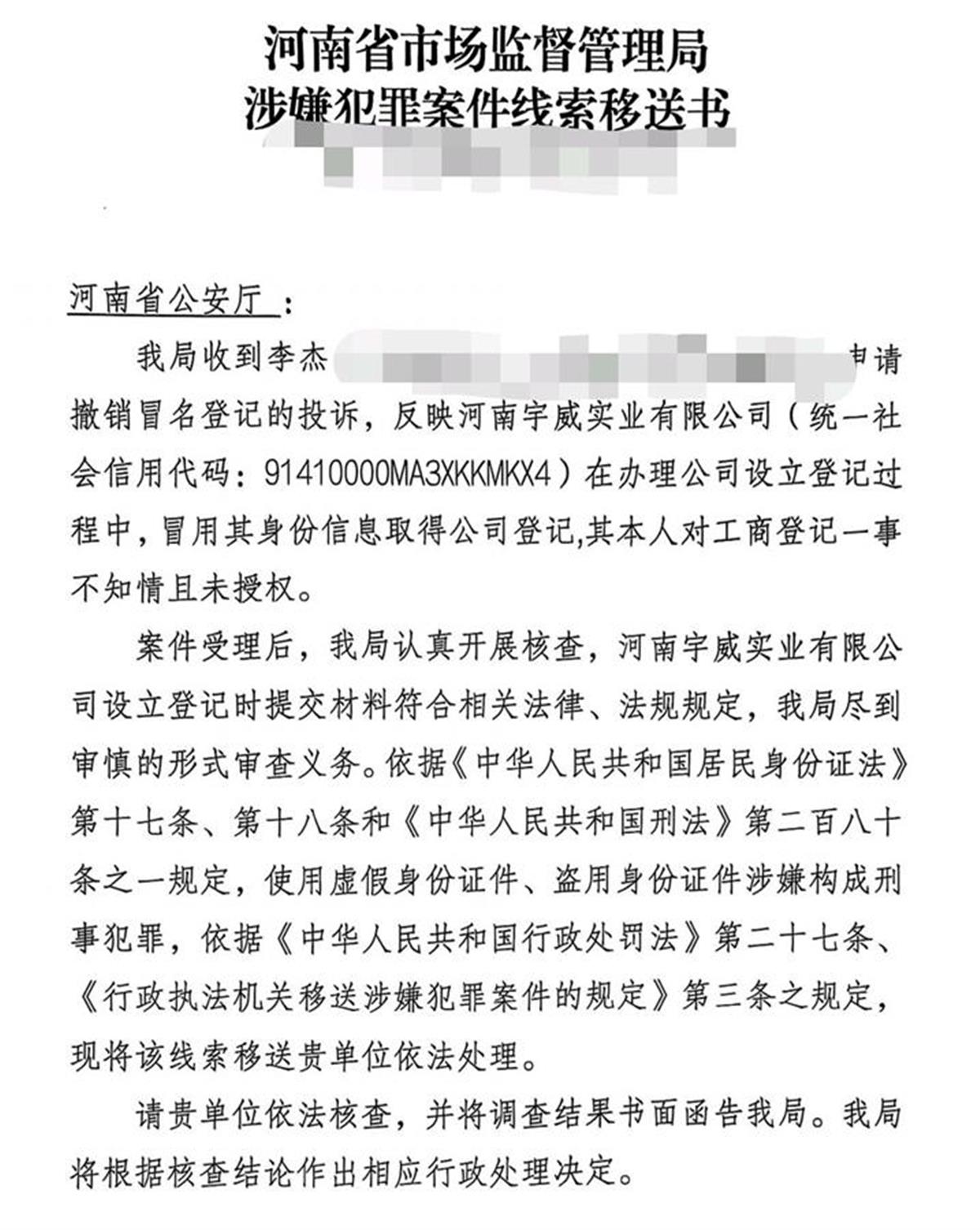 李杰提供的《河南省市场监督管理局涉嫌犯罪案件线索移送书》显示,河南省市场监管局收到李杰申请撤销冒名登记的投诉,反映涉事公司在办理公司设立登记过程中,冒用其身份信息取得公司登记,其本人对工商登记一事不知情且未授权。