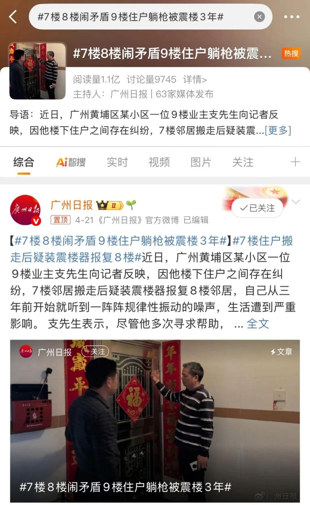 4月21日,广州日报独家报道的《7楼8楼闹矛盾9住户躺枪被震楼3年》引发全网热议,一度登顶热搜第一。