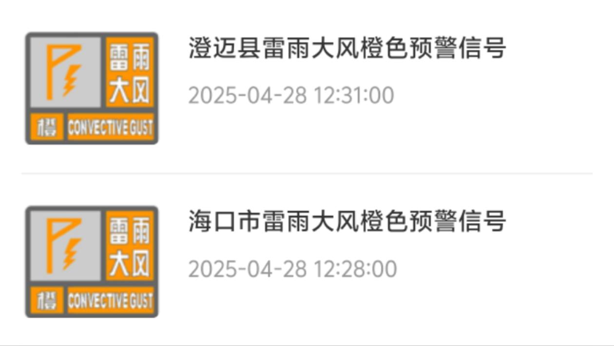 澄迈县气象台2025年4月28日12时31分变更雷雨大风黄色预警信号为雷雨大风橙色预警信号:澄迈县老城镇、桥头镇、大丰镇、福山镇、金江镇、永发镇、瑞溪镇、文儒镇、加乐镇12时40分到18时可能出现雷雨大风天气,风力达10~11级,且可能伴有冰雹、短时强降水等强对流天气,建议有关单位和人员做好防范工作。