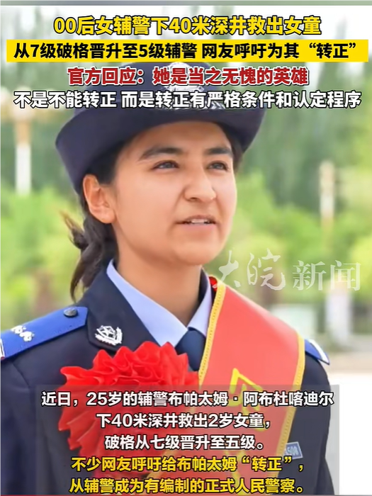 对此,“新疆发布”公众号发文回应:谈谈下井救人女辅警“转正”这件事。
