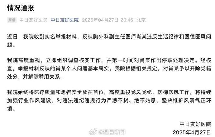 近日遭妻子实名举报的中日友好医院胸外科副主任医师肖飞,已被医院开除党籍并解聘。4月27日晚,中日友好医院公布了对肖飞的处理结果。极目新闻记者注意到,在该院的挂号预约系统,肖飞已无号可挂。