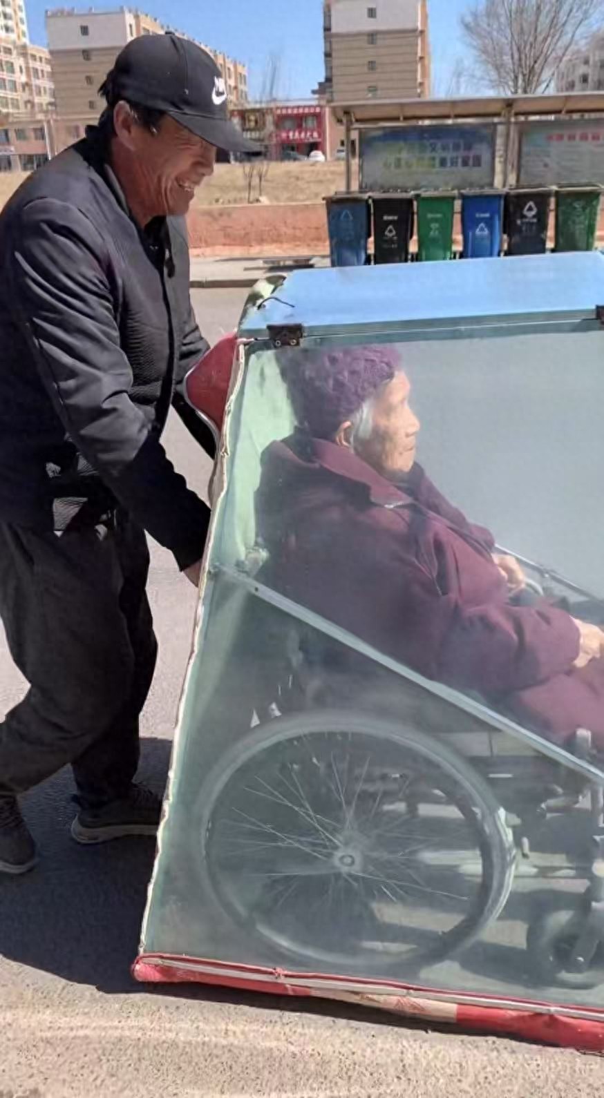 近日,辽宁阜新,一男子用轮椅自制“移动阳光房”推着老母亲逛街晒太阳的视频在网上走火。视频中,可移动的轮椅外四面都被安装了面板,老母亲坐在里面的轮椅上,男子则在后面推着逛街晒太阳。有网友称,“这是世界上最豪华的车。”