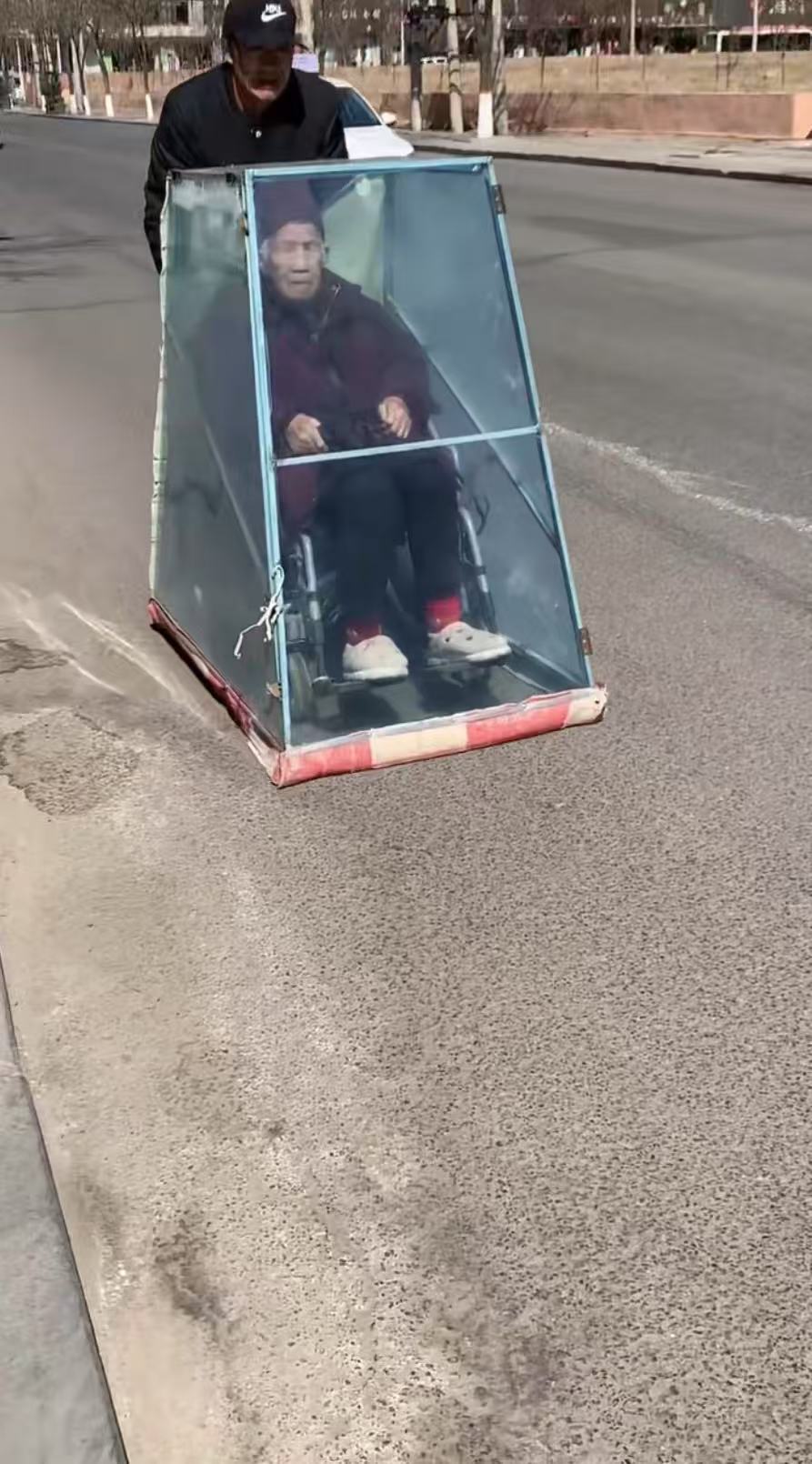据孙先生描述,东北的天气很冷,只推轮椅出去的话老人会冷。虽然视频中小车的制作看起来平平无奇,用的材料也都是非常质朴简单的材料,经过这样加工的小车就变成了一个“小暖棚”,可以防风。事后,孙先生还向记者表示,希望可以弘扬这类的暖心孝顺老人的举动。