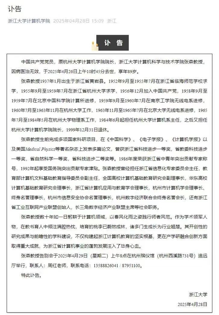 据澎湃新闻消息,知名计算机专家、浙江大学计算机学院创始人之一、浙江大学教授张森先生,因病医治无效,于2025年4月26日上午逝世,享年89岁。
