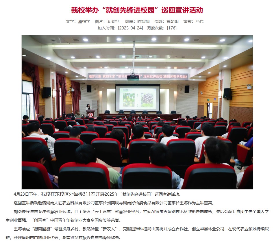 近日,衡阳师范学院、省人才发展集团、省人社厅获悉王婷的故事后,认为这是典型的就业创业“活教材”,遂邀请王婷参加“就业创业先锋进校园”巡回宣讲。4月23日,她在衡阳师范学院进行分享。