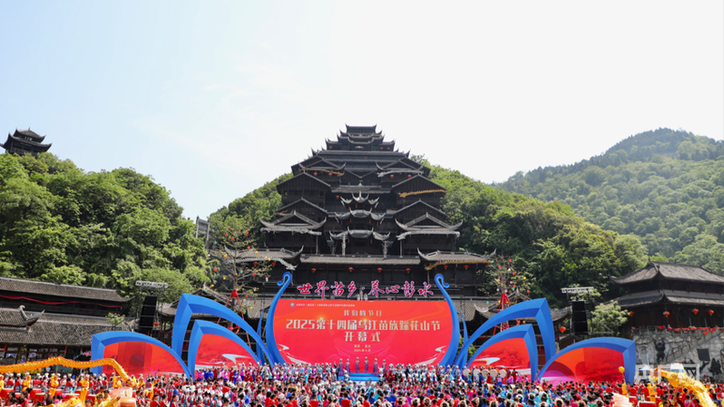 央广网重庆4月28日消息(记者白刁尹)4月28日,2025第十四届乌江苗族踩花山节在彭水自治县蚩尤九黎城开幕。八方游客和身着节日盛装的苗乡儿女,同唱娇阿依、共舞踩花山,一起品鉴武陵山区(渝东南)土家族苗族文化生态保护实验区建设成果,共同体验多姿多彩的民族风情。