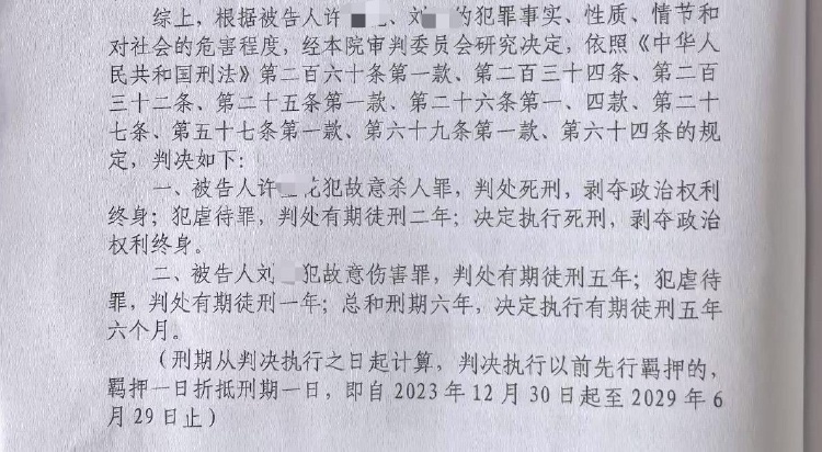 最终,一审法院判决许某花犯故意杀人罪和虐待罪,决定执行死刑,剥夺政治权利终身;刘某犯故意伤害罪和虐待罪,决定执行有期徒刑五年六个月。