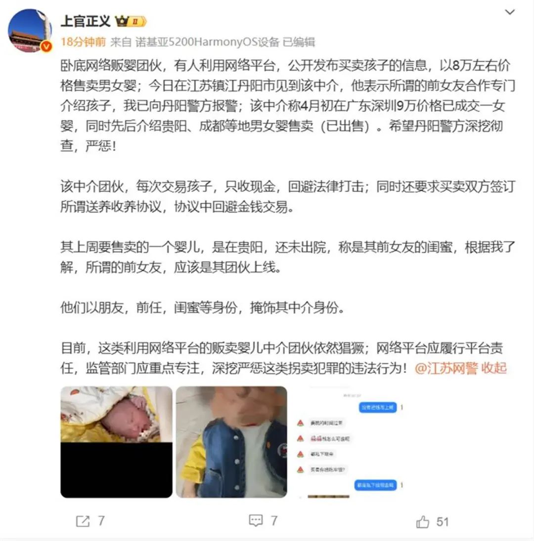 上官正义举报网络贩婴中介,以8万左右价格售卖婴儿,警方:已接到报案