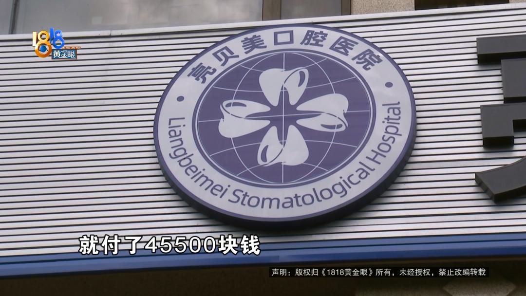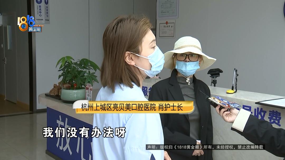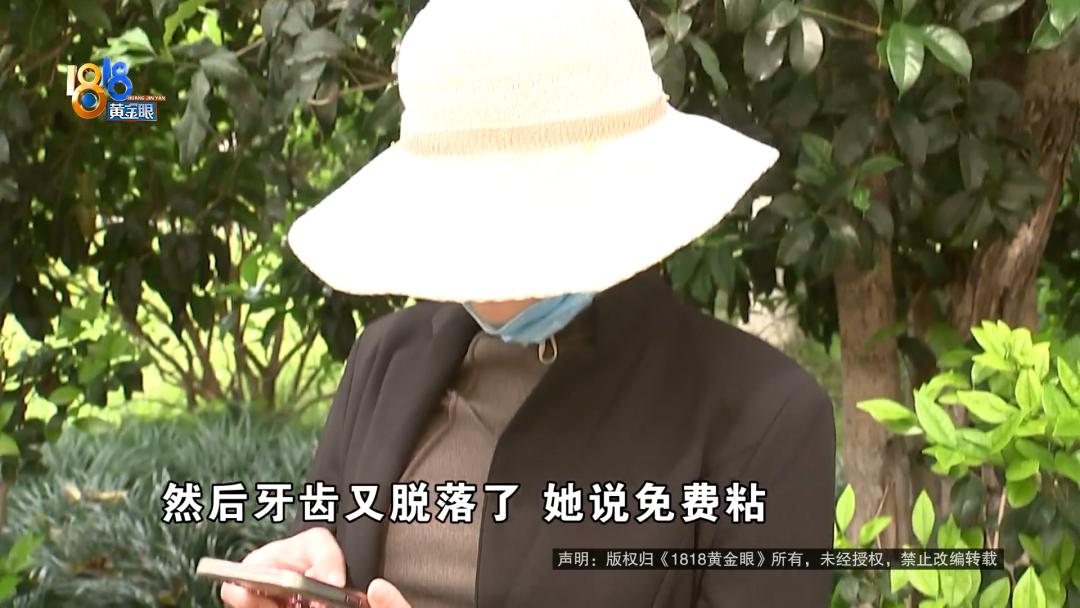 黄女士:到2024年,过了一年多,然后牙齿又脱落了,她说免费粘。粘上去之后,现在牙齿又掉了半个,前两天掉了半个,我去找医院,医院说叫我挂号,然后你这个牙齿要做的话又得付钱。我一看就不对了,我说当时你跟我说的是保终身,你现在又说跟我谈这个钱那个钱,那我当时我就不会做这个牙齿呀。那你把钱退给我,换家医院看。