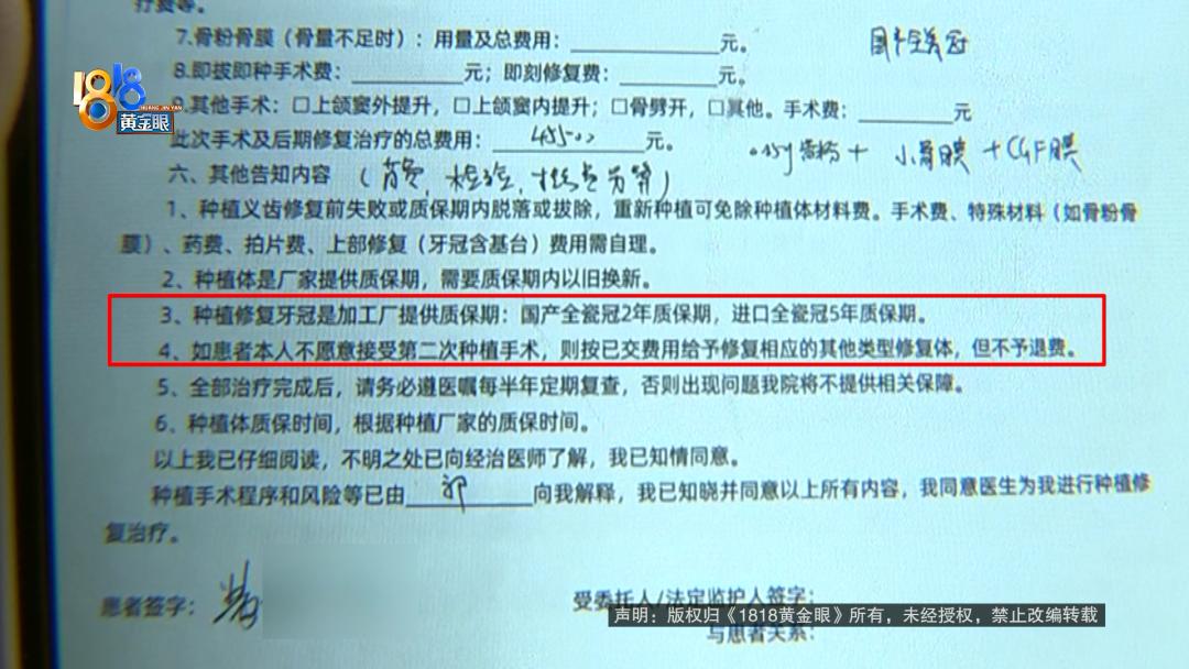 “其他告知内容”的第3条说,种植修复牙冠是加工厂提供质保期,国产全瓷冠2年质保期,进口全瓷冠5年质保期,黄女士种的是国产全瓷冠。