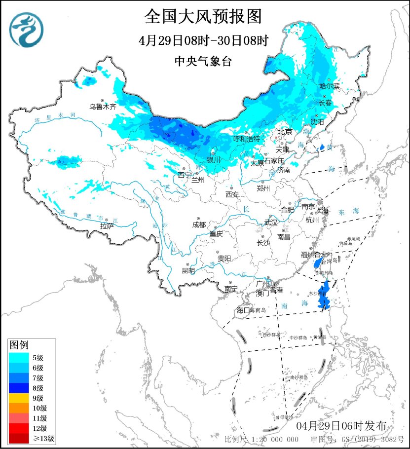 4月29日至5月1日,新疆北部、内蒙古、西北地区东部、华北、东北地区、黄淮等地将有4~6级风、阵风7~9级,西北地区部分地区有沙尘天气;内蒙古中东部、华北、黄淮等地降温4~6℃、局地8~10℃。其中,4月29日08时至30日08时,新疆东部、内蒙古大部、甘肃河西、宁夏、陕西北部、山西中北部、河北北部、辽宁大部、吉林中西部、黑龙江中西部等地有5~6级、阵风7~9级的大风,其中,新疆东部、内蒙古西部、甘肃河西等地的部分地区平均风力可达7级、阵风8~10级;台湾海峡、巴士海峡、南海东北部的部分海域将有7级、阵风8级的大风(见图1)。中央气象台4月29日06时继续发布大风蓝色预警。受大风影响,内蒙古西部和东南部、西北地区东部等地有扬沙或浮尘天气。