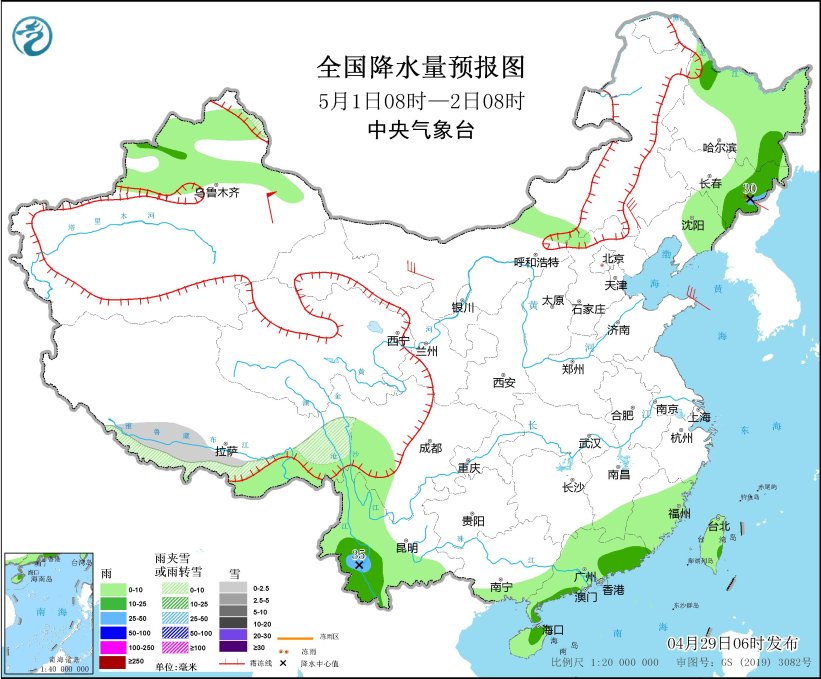 5月1日08时至2日08时,西藏东部等地部分地区有小雪或雨夹雪。新疆北部、内蒙古中部、黑龙江东部和北部、吉林中东部、辽宁东部、福建大部、江西南部、广东、广西南部、云南大部、川西高原中南部及海南岛、台湾岛等地部分地区有小到中雨,其中,吉林东部、云南西南部等地局地有大雨(25~35毫米)。新疆东部、内蒙古中西部等地部分地区有4~6级风,其中,新疆东部部分地区风力可达7级、阵风8~10级(见图4)。