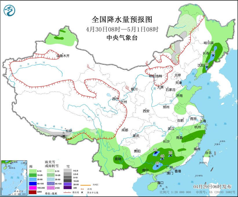 4月29日至30日,西南地区东部、华南中西部、江南南部等地先后有中到大雨,局地暴雨,并伴有短时强降水、雷暴大风等强对流天气。川西高原中北部、西藏东部等地仍有小到中雨(雪)或雨夹雪天气,高海拔山区局地有大雪;西藏东南部有中到大雨。