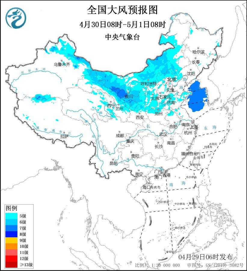 4月30日08时至1日08时,新疆北部、内蒙古大部、甘肃大部、青海东部、宁夏、陕西中北部、山西、河北北部和东南部、山东中北部、河南中北部、安徽北部等地有5~6级、阵风7~8级的大风,其中,内蒙古西部、甘肃河西地区东部等地的部分地区平均风力可达7级、阵风8~10级;黄海大部海域将有7级、阵风8级的大风。