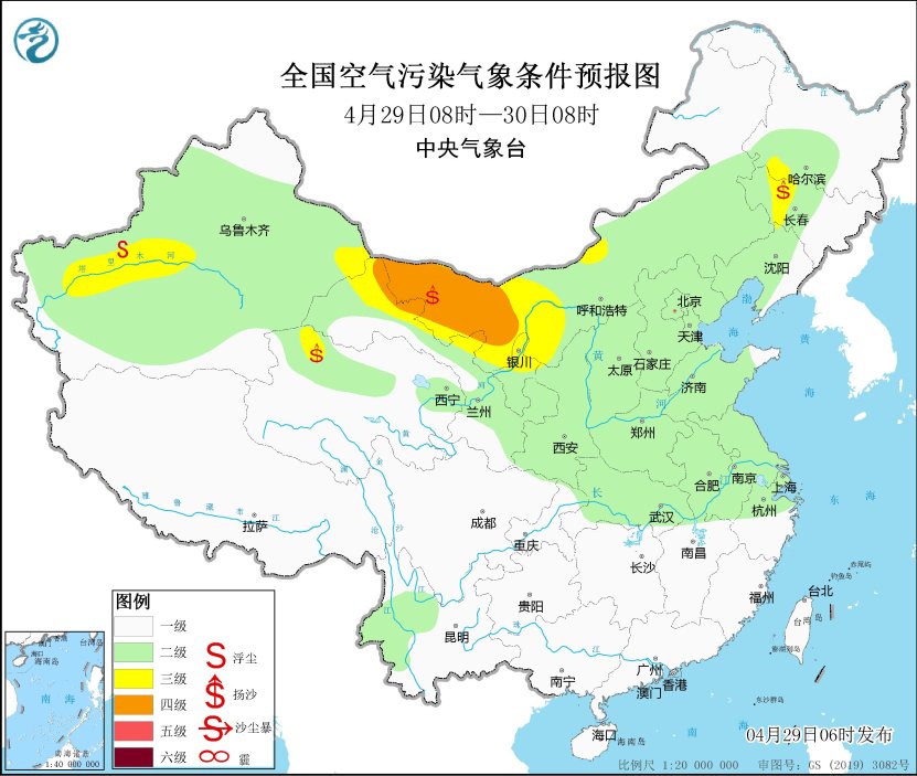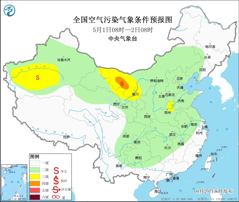 4月29日至5月1日,新疆东部、内蒙古西部、甘肃河西、宁夏中北部等地的部分地区有扬沙或浮尘天气。5月2日至3日,新疆东部和南部、内蒙古西部、甘肃河西等地的部分地区有扬沙或浮尘天气,局地有沙尘暴。此外,5月4日起,内蒙古中西部、西北地区东部等地的部分地区自西向东有沙尘天气。