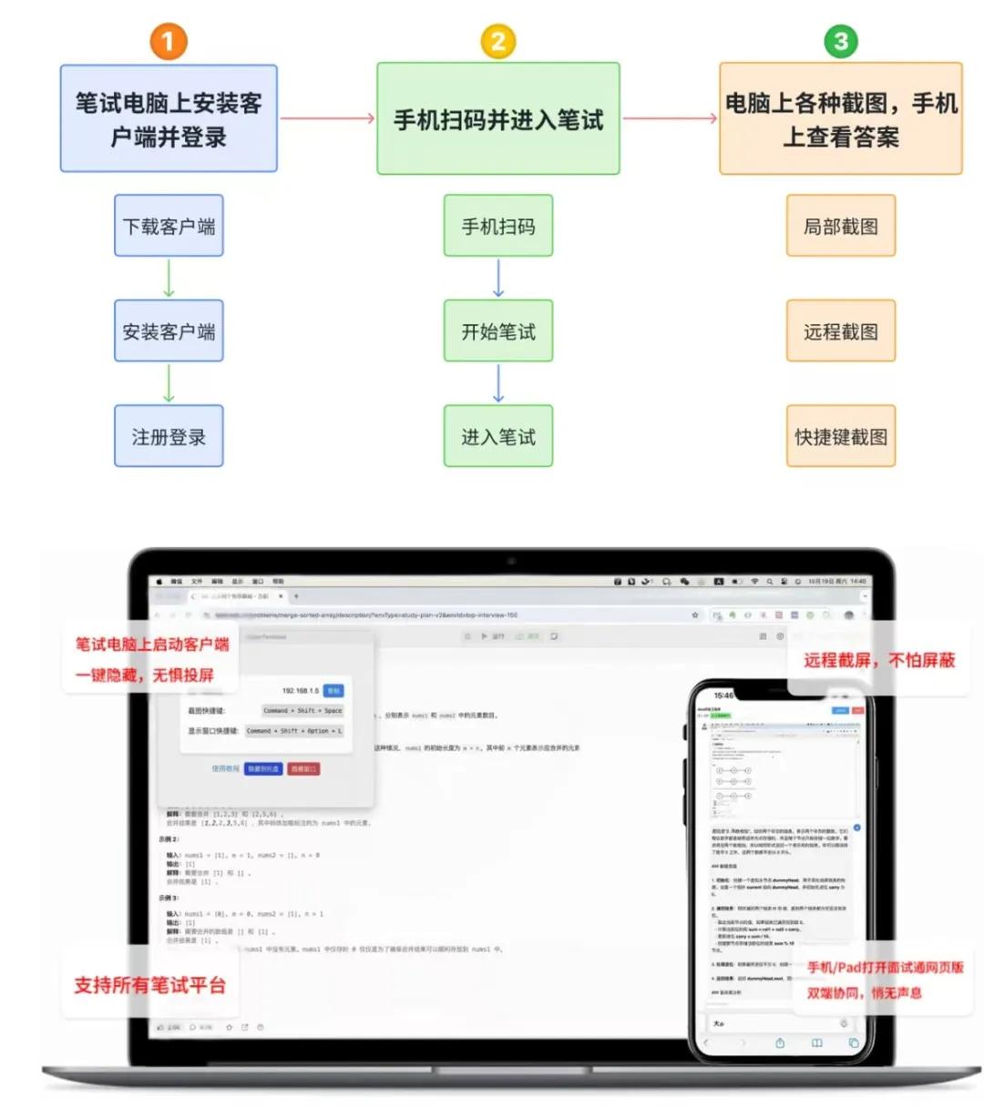 在成功案例部分,该企业在官网页面罗列了通过该软件考试成功的交流截图,并称已经帮助了千余位考生。在这些截图中,有考生分享自己通过这款软件获得了国内某大厂的offer,也有考生分享自己通过这款软件取得了考试排名第三的成绩。而在笔试辅助环节,这款软件声称,可以通过某种在电脑端后台操作的方式,与手机端配合后,让AI实时获取考题,帮助考生填写行测等试题,全程软件将在后台隐藏运行,不会被发现(可通过隐蔽传输设备传递)。