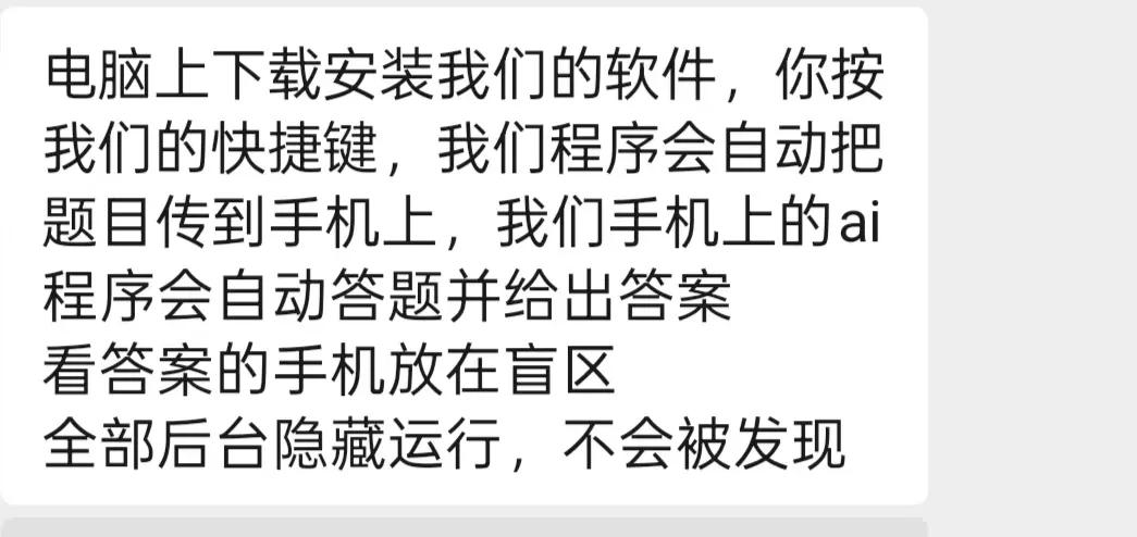 记者询问该客服,这类行为是否属于作弊行为,客服回应:“这是黑科技,大家都用,不用你就亏了。”记者又向该客服询问这款软件与市面上常规AI产品的优势,客服回应:“首先更专业,其次,不付费的AI,你考试的时候能双机位用吗?”