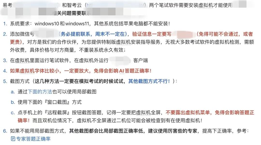针对当前不少企业线上笔试使用的几款常见考试平台,这款AI软件也给出了应对办法,以适应考试平台对辅助手段的防范。记者看到,在该客服给出的一类说明中提到,考生如果需要通过智考云、易考等平台进行考试,还需要安装虚拟机以规避考试软件对电脑后台环境的检测。“笔试辅助主要就是应对国企笔试,不考国企考啥?”这款 AI 软件的客服介绍。不过,由于这类国企考试需要通过线上报名等方式按流程操作,记者无法有效验证笔试时后台的情况,因此未能进行实际体验。