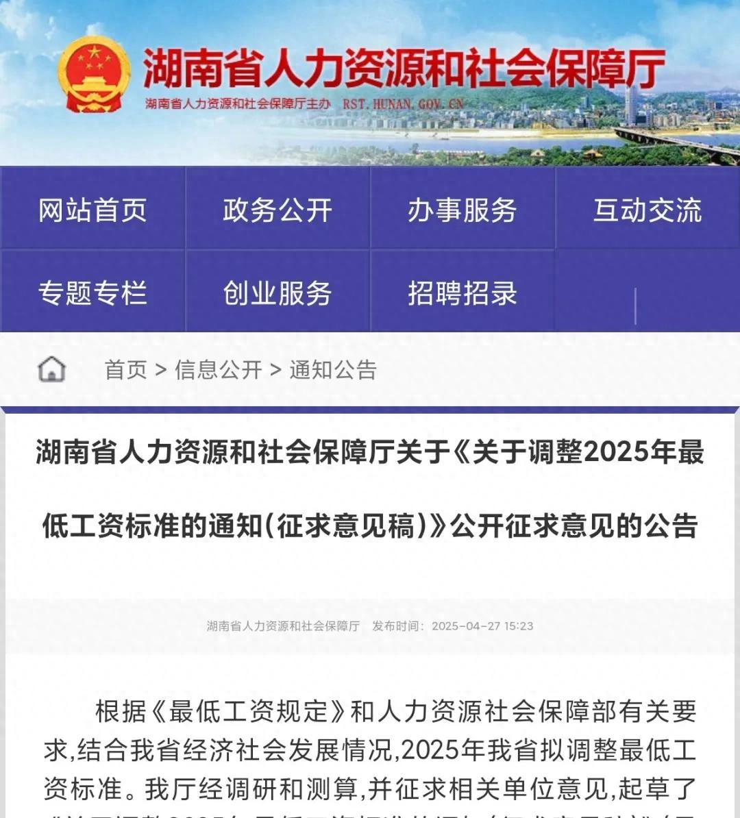 近日,湖南省人社厅公布2025年我省拟调整最低工资标准,并面向社会公开征求意见。