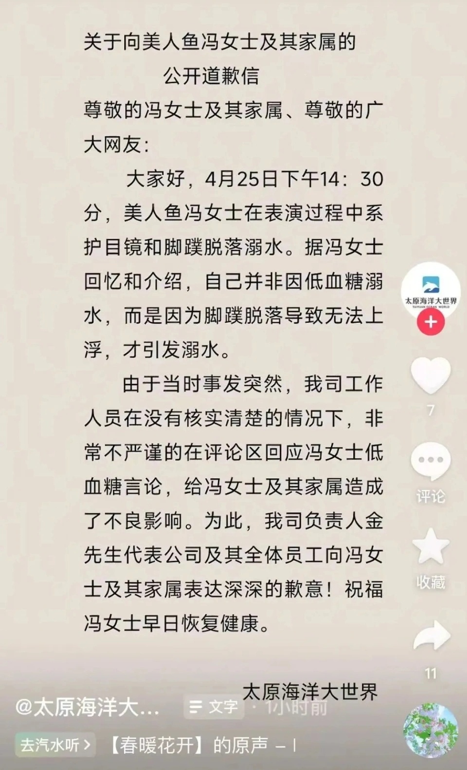 4月28日,太原海洋大世界官方账号发布《关于向美人鱼冯女士及其家属的公开道歉信》:4月25日下午14:30,美人鱼冯女士在表演过程中系护目镜和脚蹼脱落溺水。