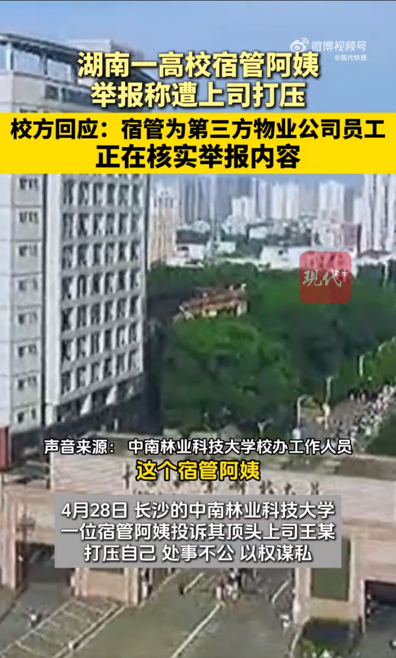 4月28日,长沙中南林业科技大学宿管阿姨聂某发帖举报,称遭遇顶头上司王某打压,还投诉其以权谋私。聂某在网帖中称,自己于2024年7月来校工作,受物业主管王某管理。因为一开始没同意将分给宿管的一间小仓库让给保安居住,引发王某不满。此后王某在不同场合打压她。在网帖里,聂某还举报王某在校园私设外卖点,向商家收取费用,以及要求工作人员买香烟等。