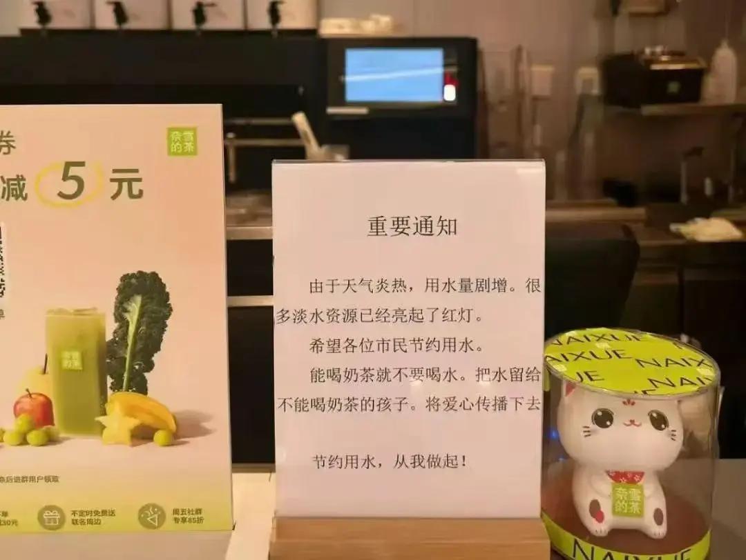 此外,图片显示,门店张贴的通知显示,“由于天气炎热,用水量剧增。很多淡水资源已经亮起了红灯。希望各位市民节约用水,能喝奶茶就不要喝水。把水留给不能喝奶茶的孩子,将爱心传播下去”。