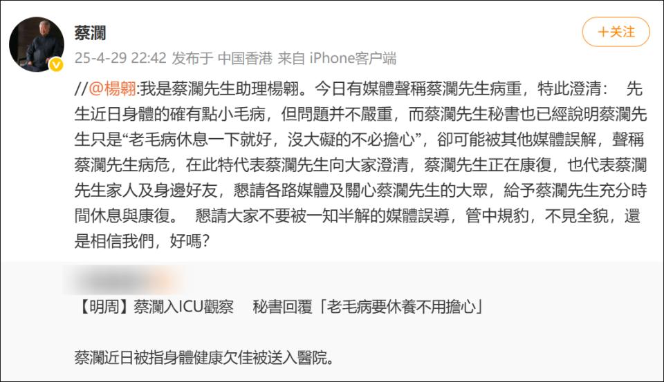 4月29日,作家@蔡澜 助理杨翱发文称,“有媒体曝蔡澜先生病重,特此澄清,近日身体的确有点小毛病,但问题并不严重。”