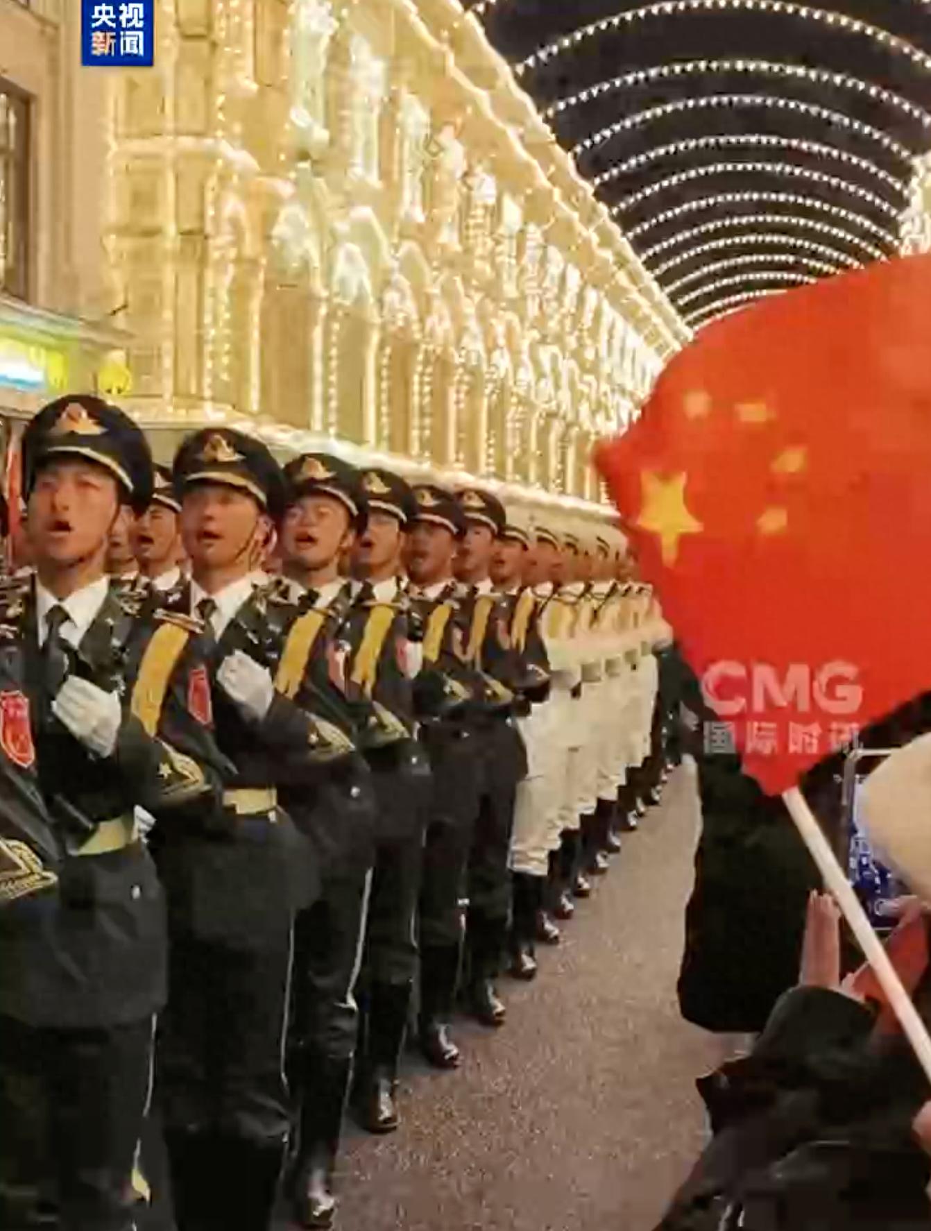 中国人民解放军仪仗司礼大队在红场参加彩排。“中国排面”亮相莫斯科街头,唱响《强军战歌》《歌唱祖国》等,受到中国留学生和当地民众热烈欢迎。当解放军仪仗司礼大队走过莫斯科街头,人们高呼“不追网红不追星,只追中国仪仗兵”。