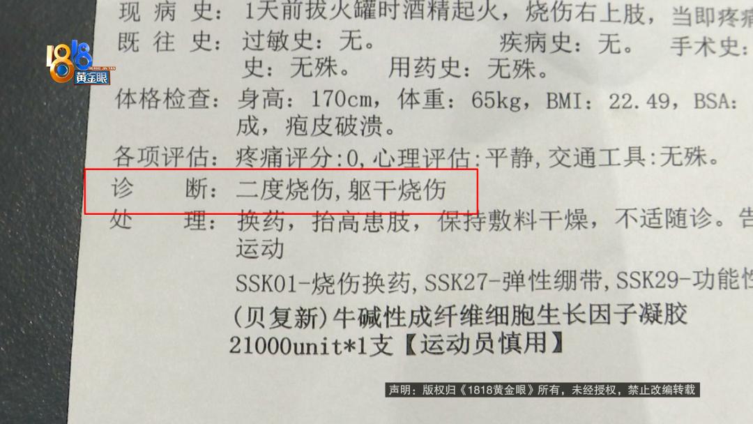 小代:(4月)15号晚上,就是刚下班,然后浑身觉得有点酸疼,可能上班上久了,然后就想着去拔个火罐。因为技师的操作失误,然后我整个胳膊就烧伤。