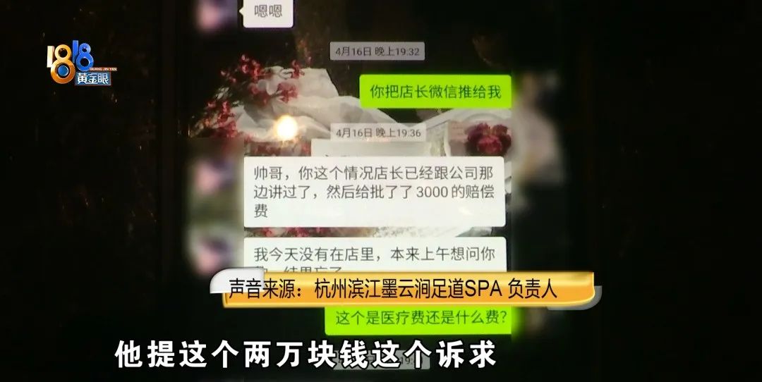 杭州滨江墨云涧足道SPA 负责人:当时他拔罐的时候,确实是我们技师可能操作上有一点失误,然后那个酒精把它烫伤。我们当时是第一时间带他去医院,有去看。他提这个两万块钱这个诉求我们是没有办法接受的。他当时跟派出所这边过来,我觉得他提的要求是相对有点过分的。他说他工作离职,然后这个东西要让我们负责。比如说你误工费,那么你误工几天,你的工资流水给我们看一下,你一天多少钱?我们觉得合理的情况下,那么我们能赔偿,我们是积极赔偿的。