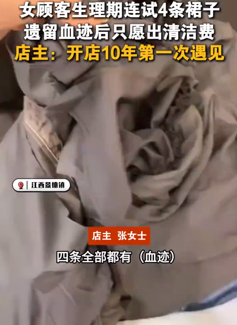 4月29日,江西景德镇,网友发布视频表示:女顾客生理期连试4条裙子,弄得裙子上有血迹。