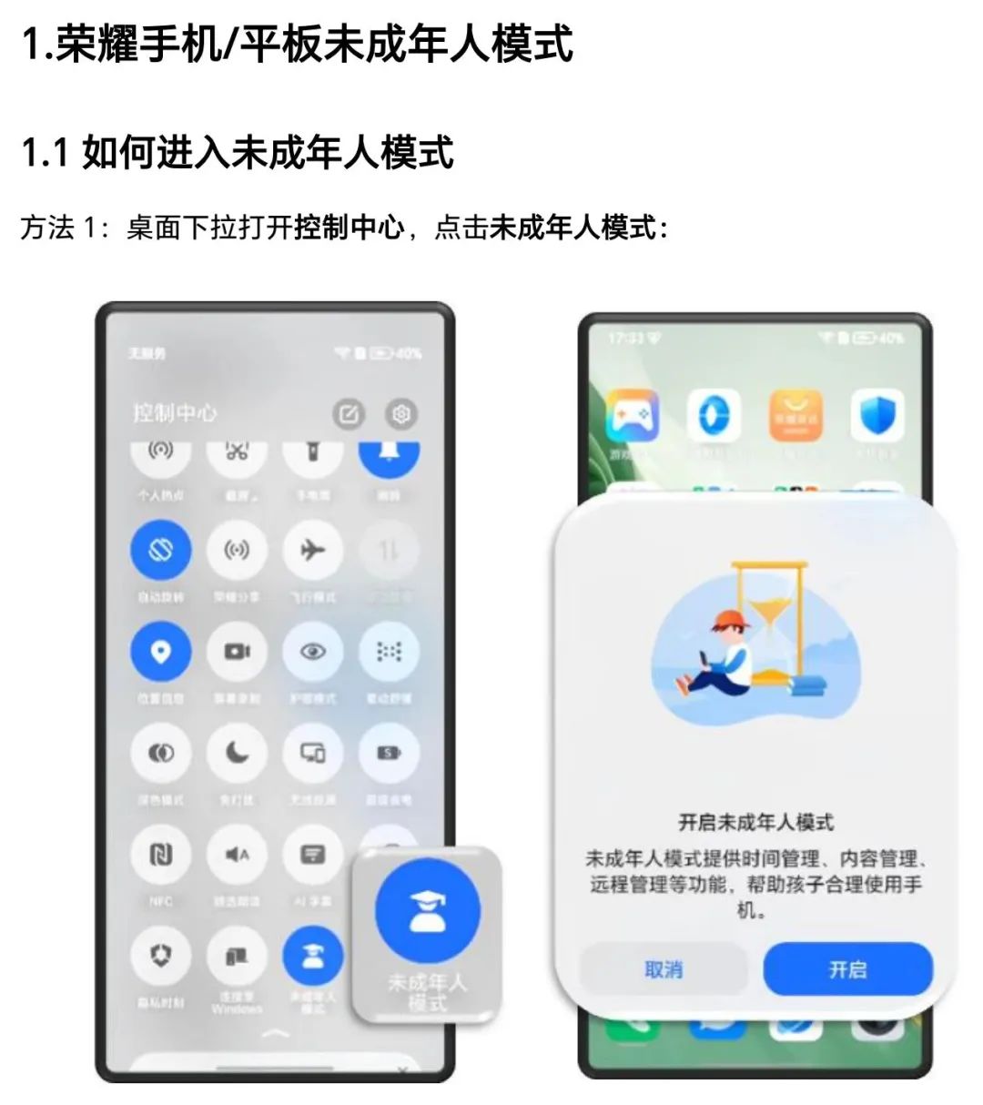 近期,软硬件企业先后上线未成年人模式,提供便捷使用功能,丰富适龄优质内容,强化信息内容安全防护。为方便广大家长和未成年人了解使用模式,多家软硬件企业集中发布未成年人模式使用手册,系统介绍模式的主要功能和特色亮点,帮助用户根据自身需求选择各项功能服务,最大限度发挥模式保护效能。