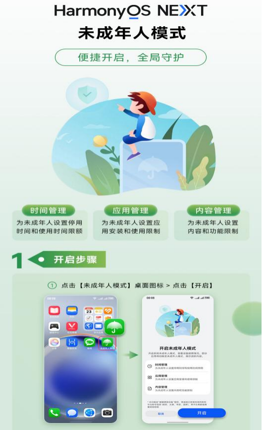 发布仪式全面展示了未成年人模式的特色亮点和主要功能。从操作方式看,移动智能终端、应用程序、应用程序分发平台实现三方联动,大大降低了模式的使用门槛。家长可在手机端显著位置点击图标,“一键启动”未成年人模式,所有应用程序同步切换,形成一个相对独立、安全可控的上网环境。从内容生态看,适合未成年人的优质内容得到大幅扩充,重点平台依托儿童内容创作者、版权资源、权威机构等,筛选海量内容纳入未成年人模式,并建立年龄分层、内容分类、推荐分众的梯度化内容体系,更好满足未成年人的精神文化需求。从功能服务看,未成年人模式可以提供每日上网总时长控制、使用时段设置、休息提醒、应用管理、使用情况统计等功能,家长可根据实际情况调整各项设置,实现对未成年人上网行为的合理引导。从覆盖范围看,华为、OPPO和中兴在手机系统更新后提供未成年人模式,小米、荣耀和vivo在发布的新机上搭载未成年人模式,应用商店建立未成年人专区,短视频、社交、电商、教育、工具等领域重点应用程序全面升级未成年人模式。后续模式的覆盖范围还将持续扩大,满足未成年人日常使用需求、提供丰富多元服务。