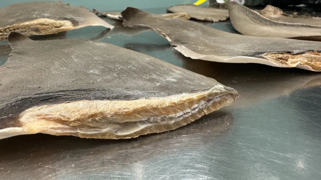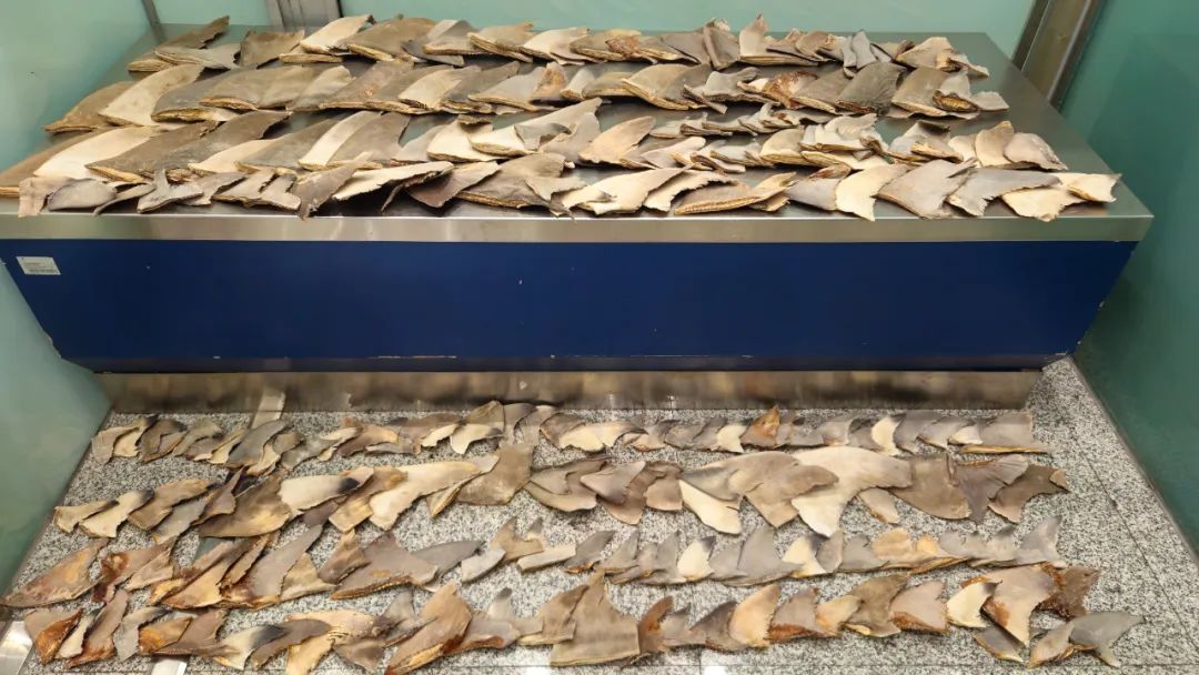 现场关员对进境航班进行监管时,发现一名选择无申报通道通关的旅客行李机检图像存在大量不明阴影。经开箱查验,现场关员在该名旅客行李中查获疑似鲨鱼翅593件、净重32千克,疑似鳖裙边2包、净重12.75千克。经鉴定,相关物种分别属于《濒危野生动植物种国际贸易公约》(CITES)附录I中的宏鳖、恒河鳖,附录II中的印度小头鳖、公牛真鲨、鼬鲨、侧条真鲨、无沟双髻鲨、高鳍真鲨、路氏双髻鲨。