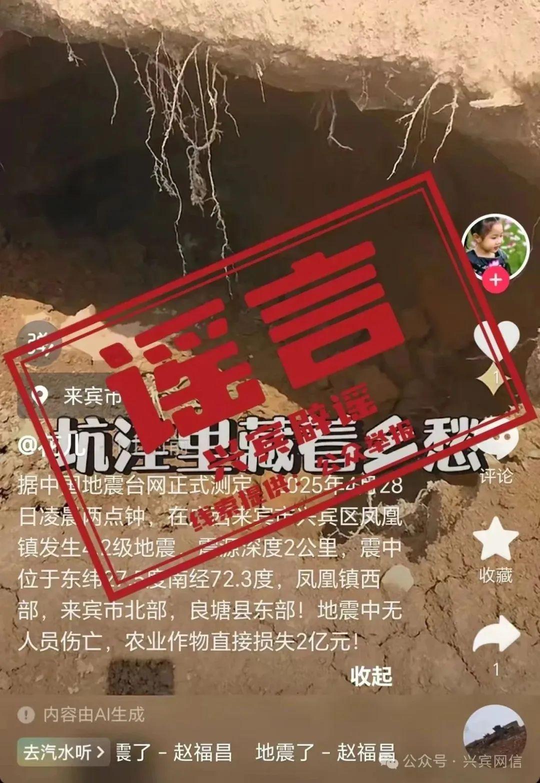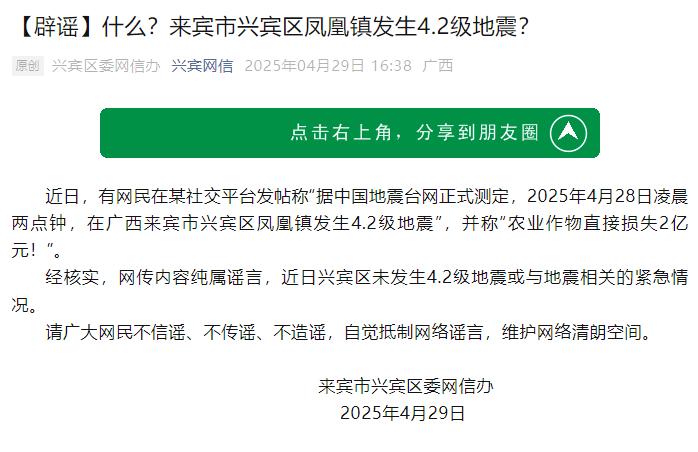 近日,有网民在某社交平台发帖称“据中国地震台网正式测定,2025年4月28日凌晨两点钟,在广西来宾市兴宾区凤凰镇发生4.2级地震”,并称“农业作物直接损失2亿元”。