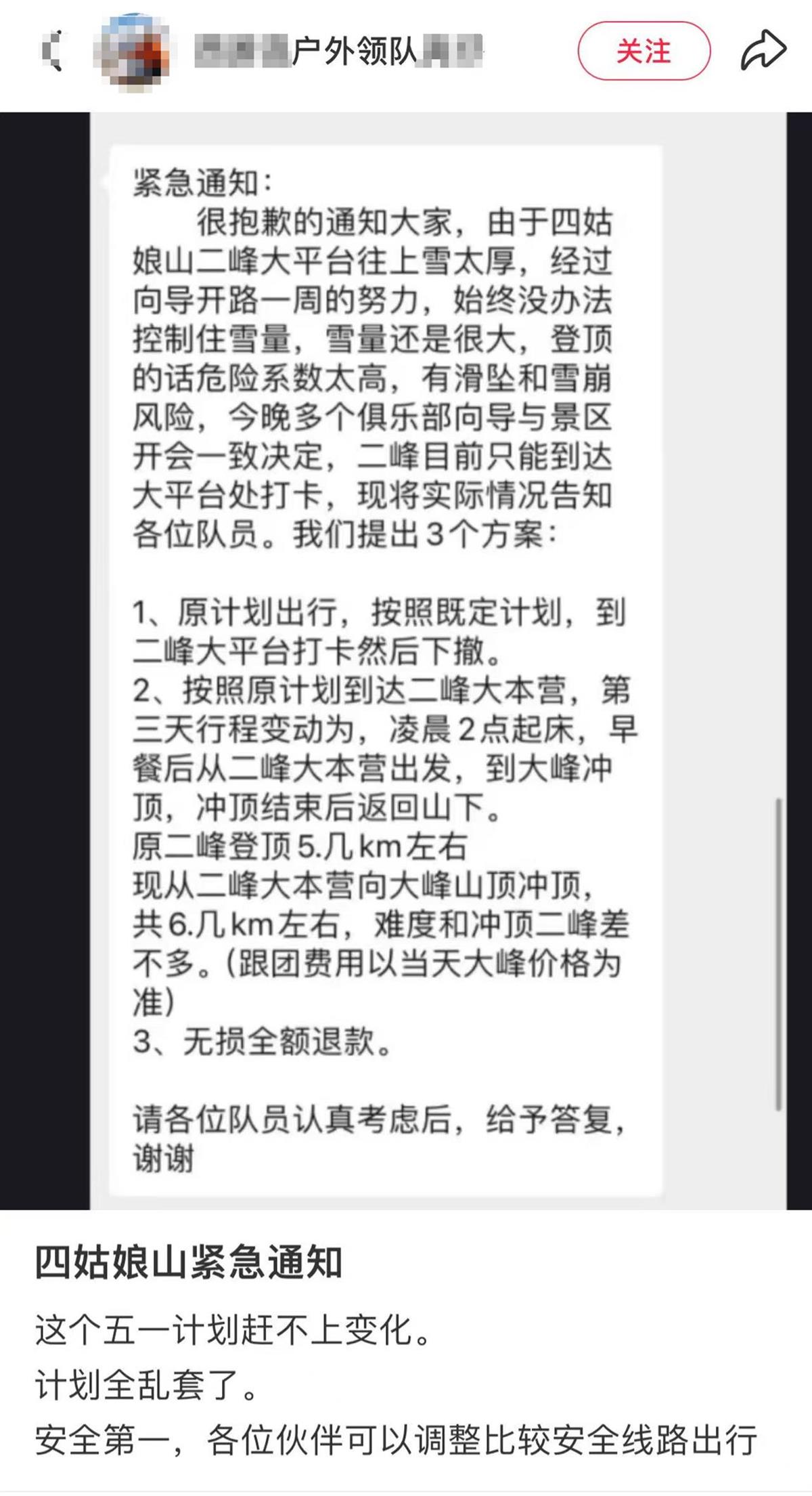 该领队配了一张“紧急通知”的图片,通知显示,四姑娘山二峰大平台往上雪太厚,登顶危险系数太高,有滑坠和雪崩风险,二峰目前只能到达大平台处打卡。并提出3个方案,其中包括全额退款。
