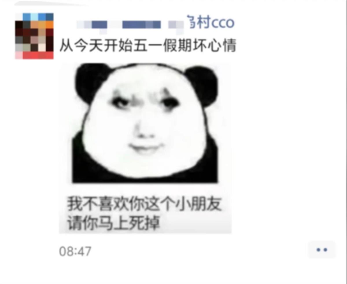极目新闻记者看到,据该博主截图,乌村乡村休闲度假区这名员工发的一条朋友圈动态中称,“从今天开始五一假期坏心情”并配有一张表情图片,图片上的文字为:“我不喜欢你这个小朋友,请你马上死掉。”