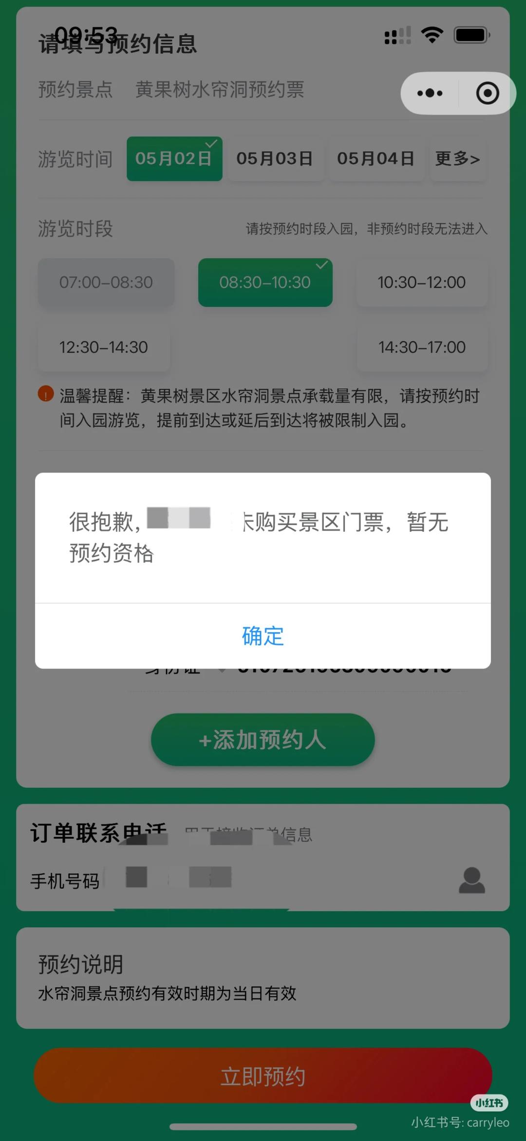 据她介绍,因和家人准备“五一”期间前往贵州游玩,4月23日,她在某平台购买了3人“五一”期间游玩黄果树风景名胜区的门票。购票时,平台并未提醒景区水帘洞游览需预约。直到4月29日,她得知这一情况后赶紧预约,但从上午到下午,3人中仅有2人预约成功,另一人在预约时却提示“未购买景区门票,暂无预约资格”。