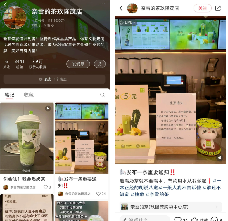 网友发布的照片及截图显示,该店曾于4月25日在小红书账号发布帖文,帖文的标题为《发布一条重要通知》,配文是:“能喝奶茶就不要喝水,节约用水从我做起!”帖文后还附带了话题“一本正经的胡说八道”“一般人我不告诉他”等。