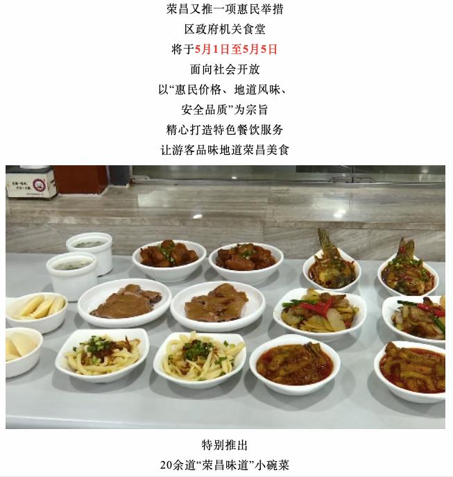 据重庆荣昌区融媒体中心4月28日消息,荣昌区政府机关食堂将于5月1日至5月5日面向社会开放,以“惠民价格、地道风味、安全品质”为宗旨精心打造特色餐饮服务让游客品味地道荣昌美食。特别推出20余道“荣昌味道”小碗菜如猪油泡粑、羊肉汤、荣昌卤鹅、黄凉粉、回锅肉等,每份菜品价格3元至18元,游客可“一站式”品尝荣昌本土特色美食。