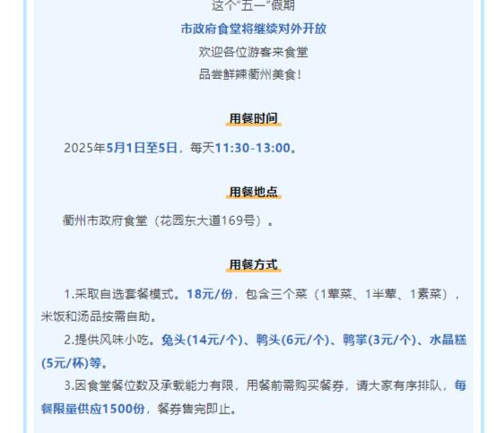 据“衢州发布”消息,5月1日到5日,衢州市政府食堂每日11时30分到13时提供中餐。主打“鲜辣衢州”风味,推出18元每份的标准套餐,含一荤一素一半荤半素菜。此外还有兔头、鸭头、鸭掌等风味小吃。因食堂餐位数及承载能力有限,用餐前需购买餐券,每餐限量供应1500份,餐券售完即止。