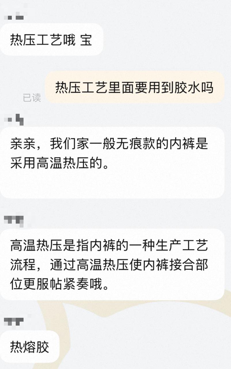 潇湘晨报·晨视频记者梳理发现,目前市面上的无痕内裤一般通体采用冰丝面料(较多为锦纶与氨纶组成),侧边由胶水粘合,底裆则以纯棉或粘纤桑蚕丝复合材质居多,肉眼观察无明显缝线痕迹。某知名内衣品牌旗舰店客服表示,该品牌的无痕内裤采用高温热压的方式使内裤结合部位服帖紧凑。当记者继续追问内裤制作过程中是否添加胶水等粘合剂时,客服表示会使用热熔胶。也有知情人士透露,“无痕内裤若使用线缝合,无痕的效果会大打折扣。”