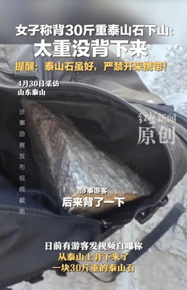日前有游客发视频自曝称,从泰山上背下来了一块30斤重的泰山石。该游客所发布的视频中,有一块石头被放在背包中。