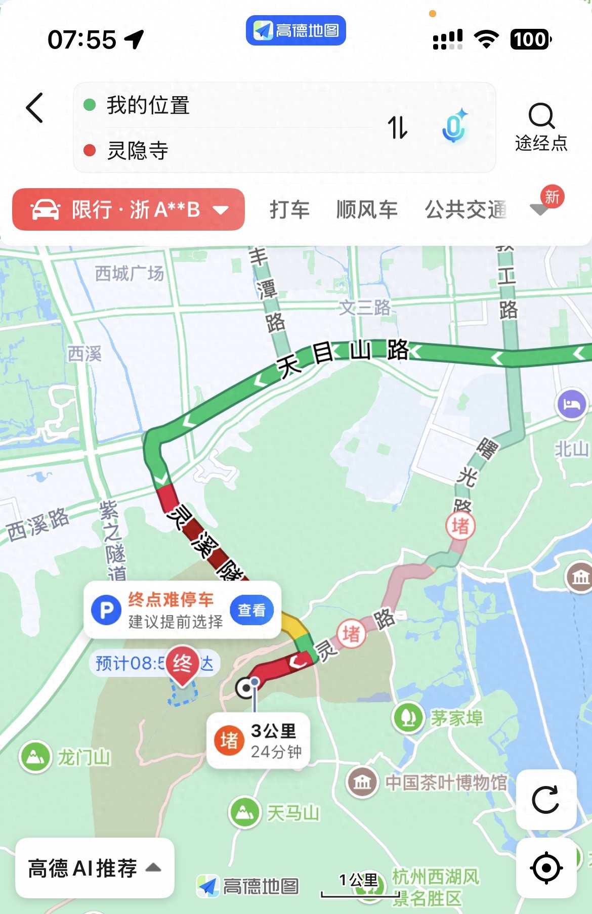 早上8点钟不到,记者打开手机地图软件发现,进出景区的灵溪隧道、灵隐支路已经堵成了红色,页面还发出了“终点难停车”的提醒。