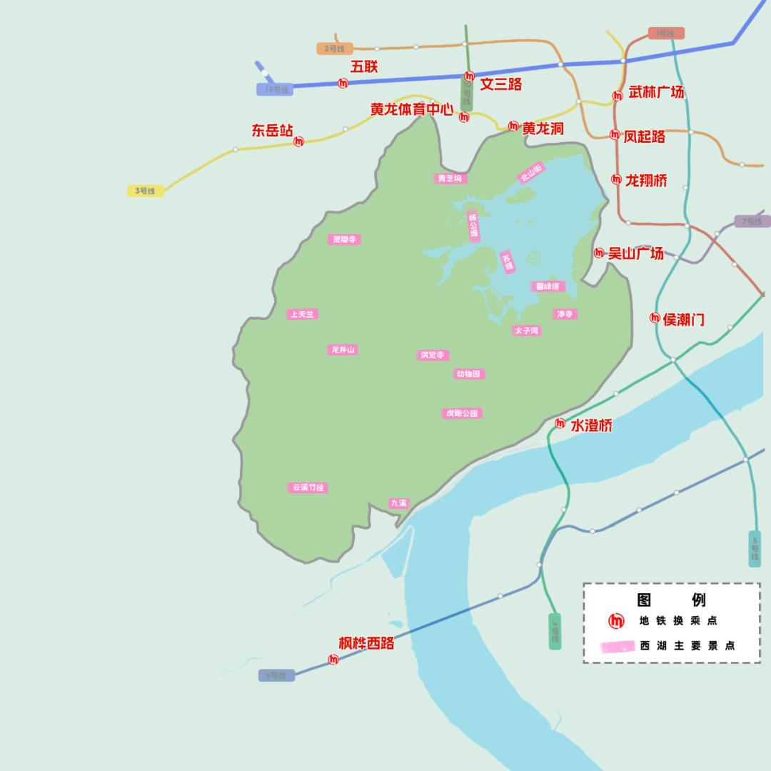 在凤起路站(1、2号线)、黄龙洞站(3号线)、东岳站(3号线)、黄龙体育中心站(3、10号线)、水澄桥站(4号线)、吴山广场站(7号线)、龙翔桥站(1号线)、武林广场站(1、3号线)、候潮门站(5号线)、枫桦西路(6号线)、文三路站(19号线)、五联站(19号线)等12处地铁站,市民游客可通过“地铁+公交”接驳线直达西湖景区内部景点。