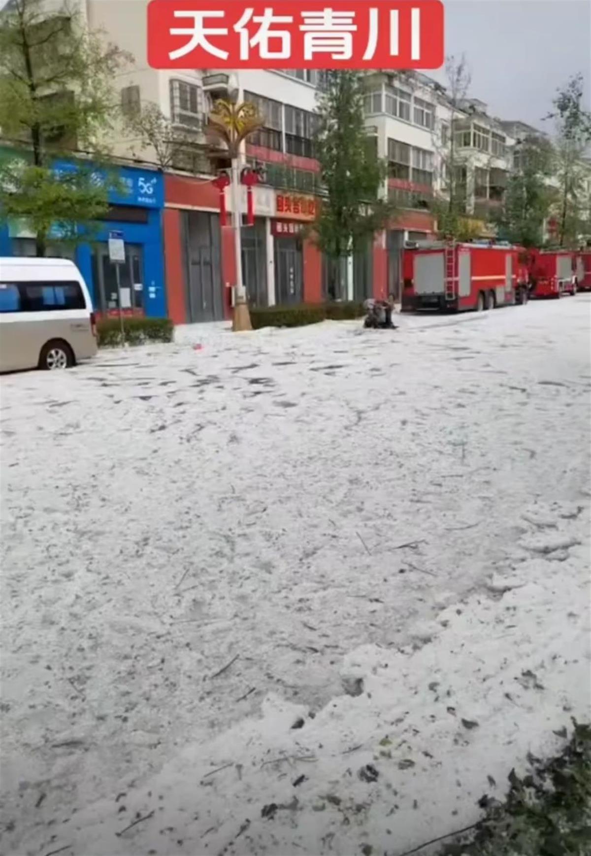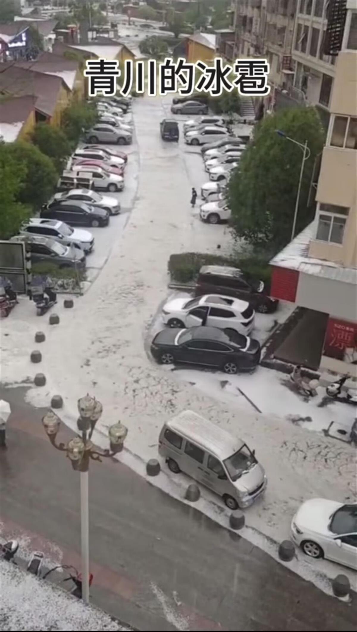 4月30日下午,四川省广元市青川县突降冰雹,部分片区道路白茫茫一片,冰雹汇聚成“冰河”。