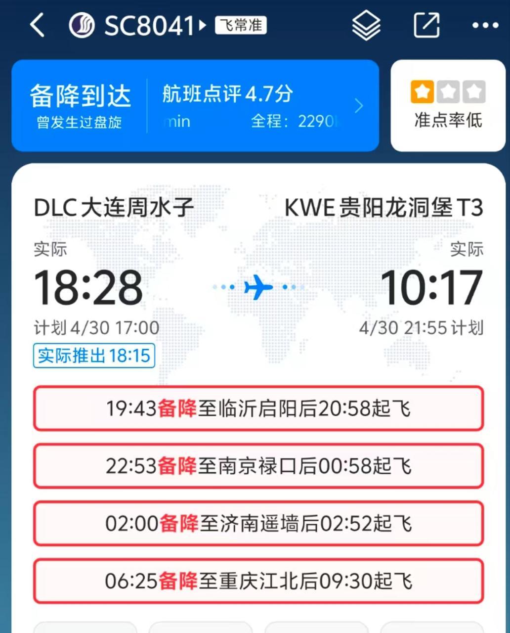 5月1日,一趟原定于4月30日下午5时从大连起飞,当晚9时55分抵达贵阳的山东航空航班出现数次备降,最后于1日上午10时许才降落贵阳,引发众多关注。