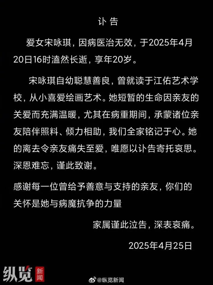 宋咏琪的家属在讣告中称:宋咏琪自幼聪慧善良,曾就读于某艺术学校,从小喜爱绘画艺术。她短暂的生命因亲友的关爱而充满温暖,尤其在病重期间,承蒙诸位亲友陪伴照料、倾力相助,我们全家铭记于心……纵览新闻记者尝试私信联系其家属,截至发稿未得到回复。